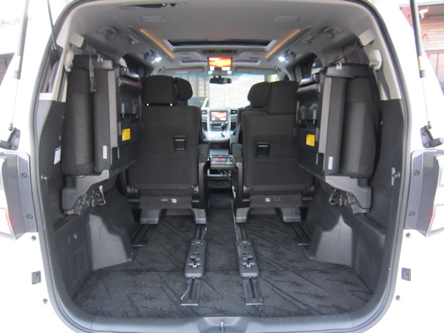 | 装備 | メーカー純正ナビ・TV、バックカメラ、トヨタプレミアム18スピーカーサウンドシステム、リアエンターテイメントシステム、両側パワースライドドア、パワーバックドア、ツインサンルーフ、TRDフロント&リアエアロ、外マフラー、新型ヴェルファイア18インチアルミホイール、RSR車高調、クルーズコントロール、ビルトインETC、室内LED証明 、HIDフォグライト、100Vコンセント |